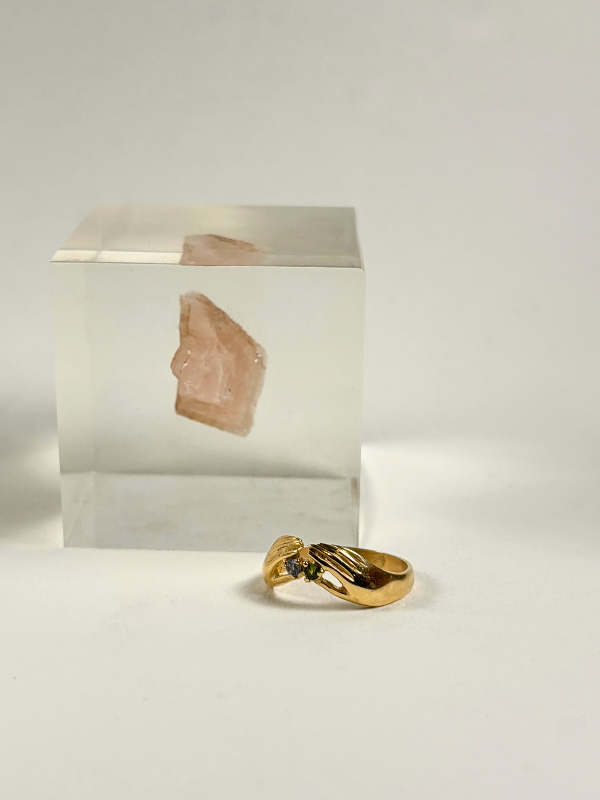 This unique 14K gold stacking ring features a playful yet meaningful design, where two delicate gold hands gently hold two small, vibrant gemstones—peridot and aquamarine. The hands, crafted in polished 14K gold, seem to cradle the stones with care, symbolizing protection and the bond between nature and the wearer. The peridot, with its fresh green hue, and the aquamarine, with its tranquil blue tones, bring a sense of balance and harmony to the design.
