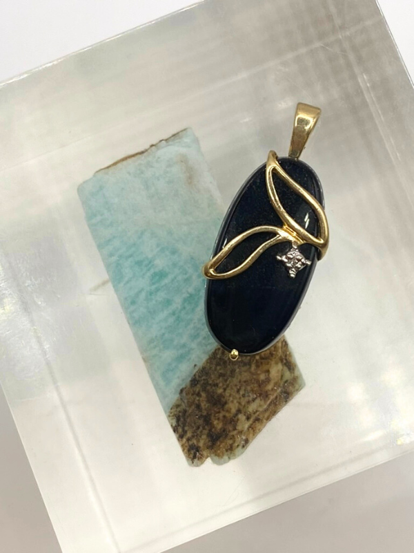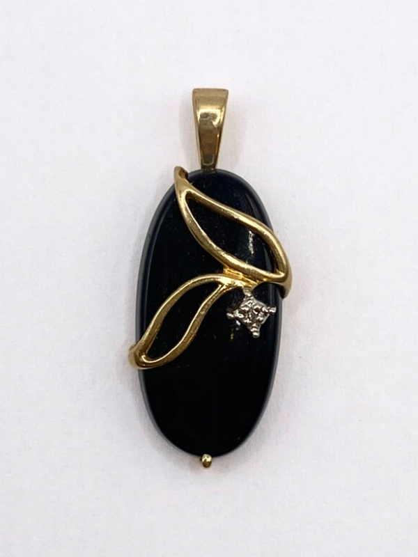 Elevate your collection with this exquisite mid-century onyx charm, showcasing a stunning oval-shaped onyx at its center. The charm features beautifully outlined leaf designs in rich 14K gold, elegantly layering the stone and adding a touch of nature-inspired artistry. A single diamond accent sparkles delicately, enhancing the charm's sophistication. Would fit seamless with any chain or jacket pin. Perfect to wear with your favorite band tee or a cocktail dress, this charm captures the timeless beauty of its era while offering a modern flair.