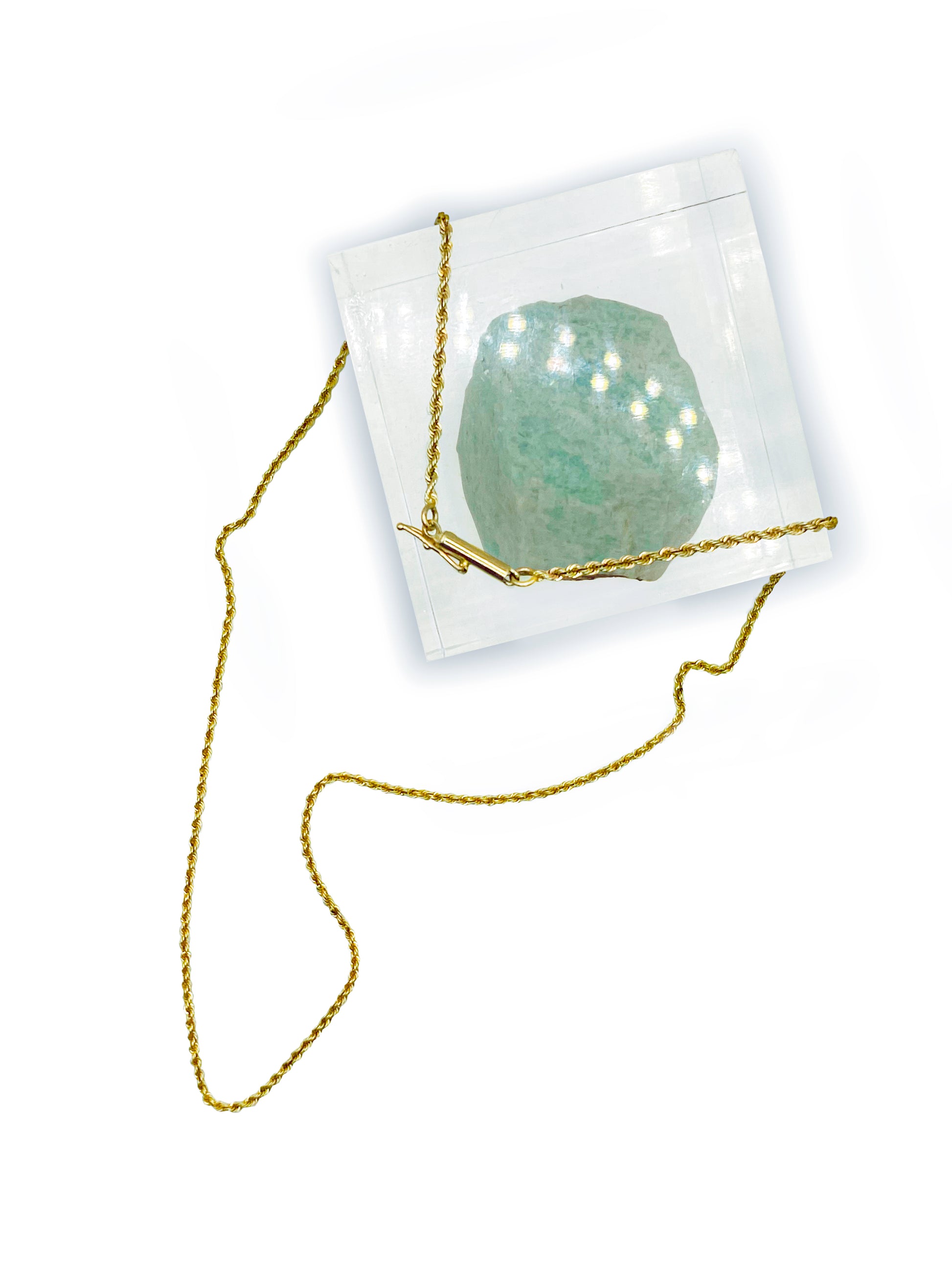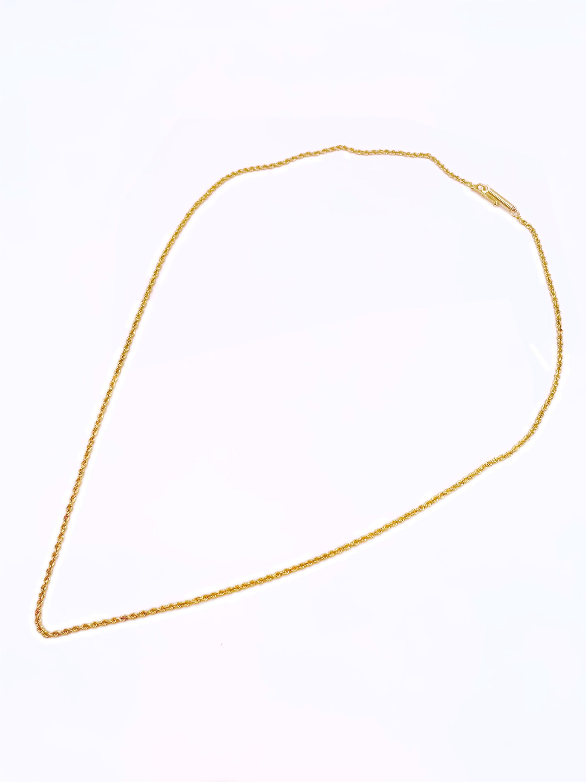 A beautiful must have everyday gold chain. Glowing 14k Yellow Gold, this perfect timeless pendant rope chain design, measuring 18" long complete with a secure interlocking barrel style clasp and safety. This perfect vintage 14k Yellow Gold pendant rope is a solid chain thick enough to wear alone or with your favorite pendant. A statement with your layering necklace/chain collection..... its timeless. You can wear it out to that party you have been waiting for or with jeans and a tee