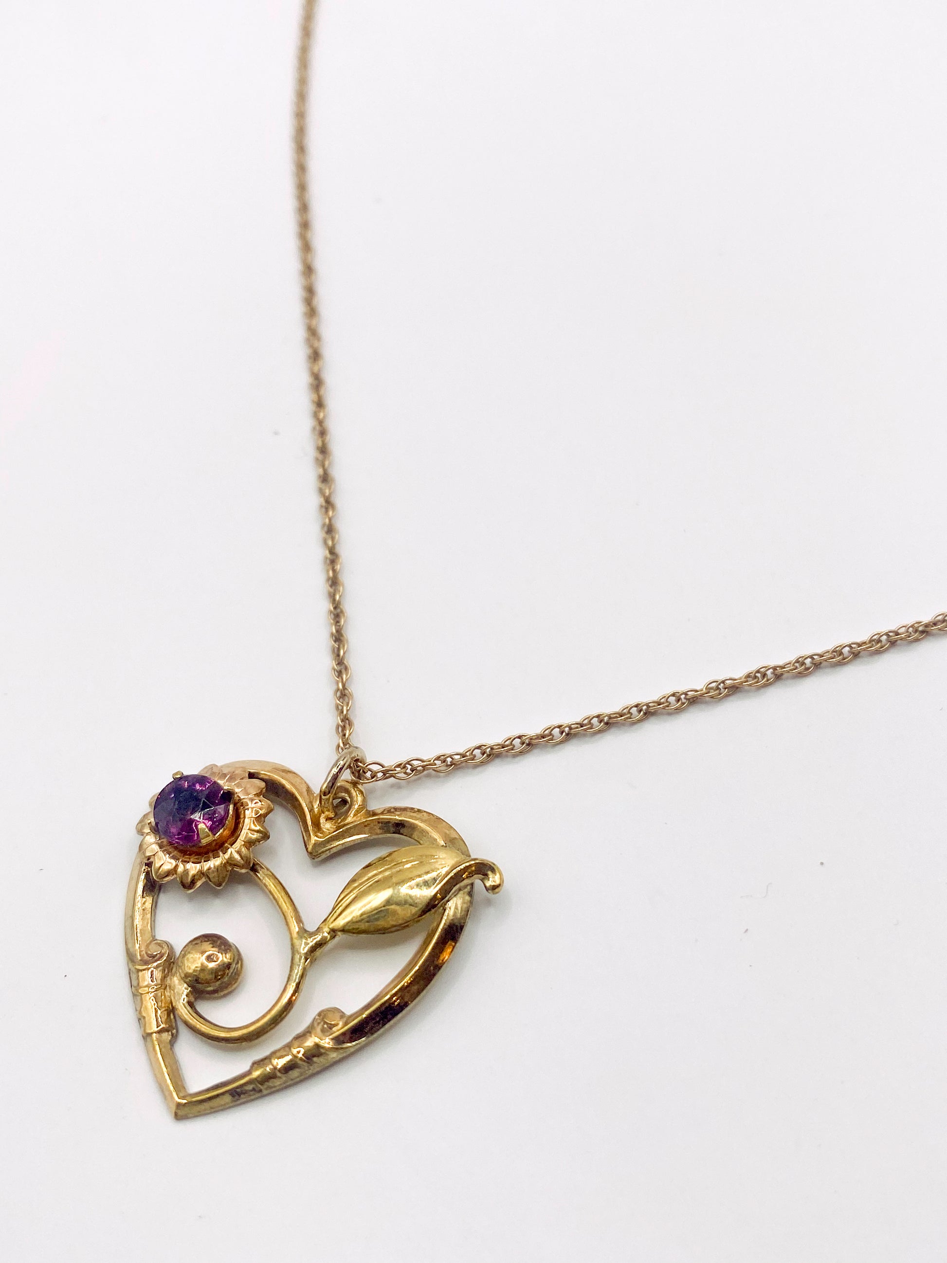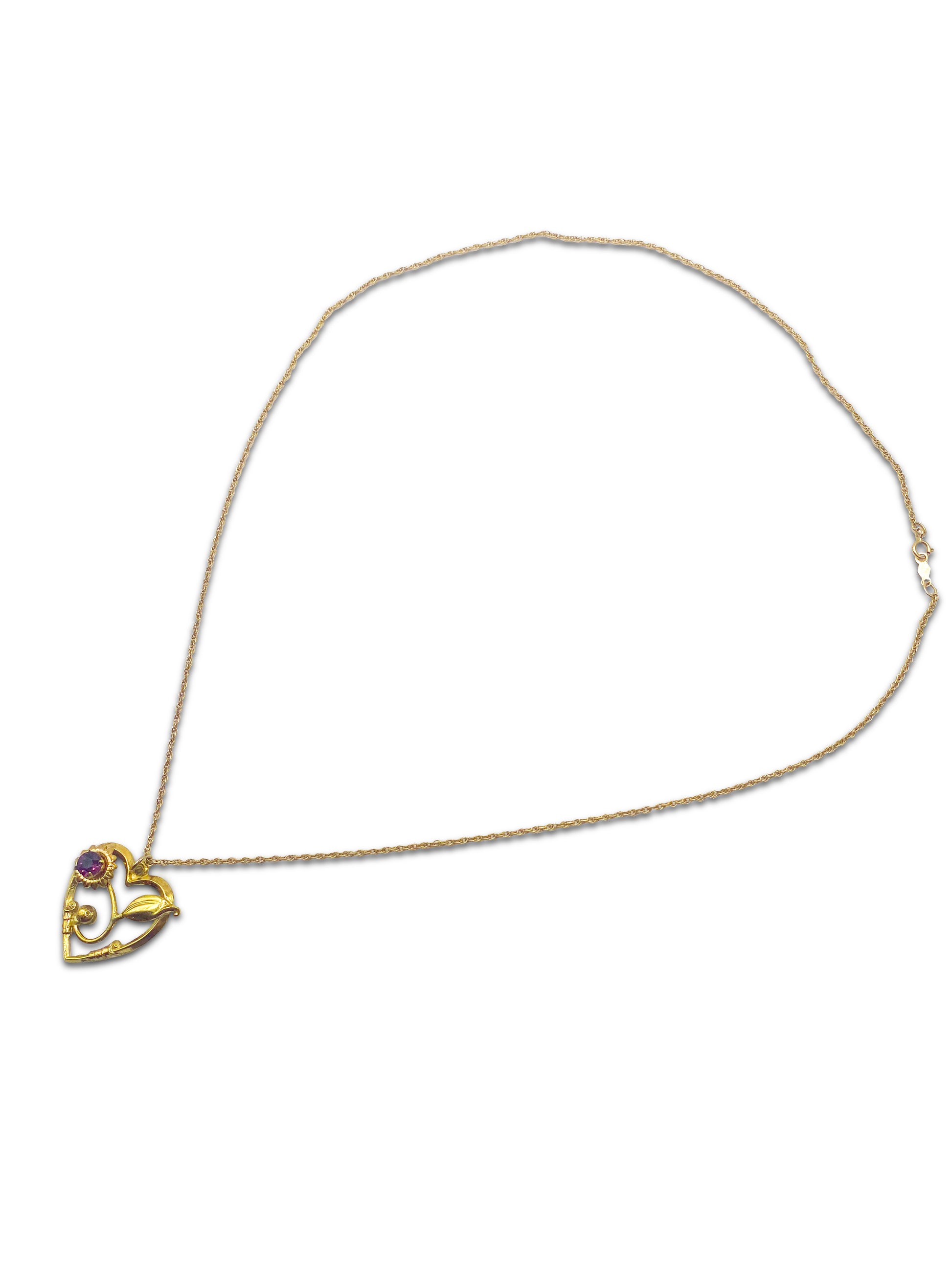 A very pretty 14K gold rope chain. This captivating beauty will be a perfect addition to your collection. This stunning piece showcases a classic heart intertwined with a enchanting flower. Embrace the symbolism of love and growth with this unique necklace! This pendent features amethyst as the center of the flower, to add a even a little more sparkle.