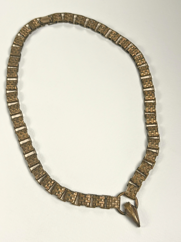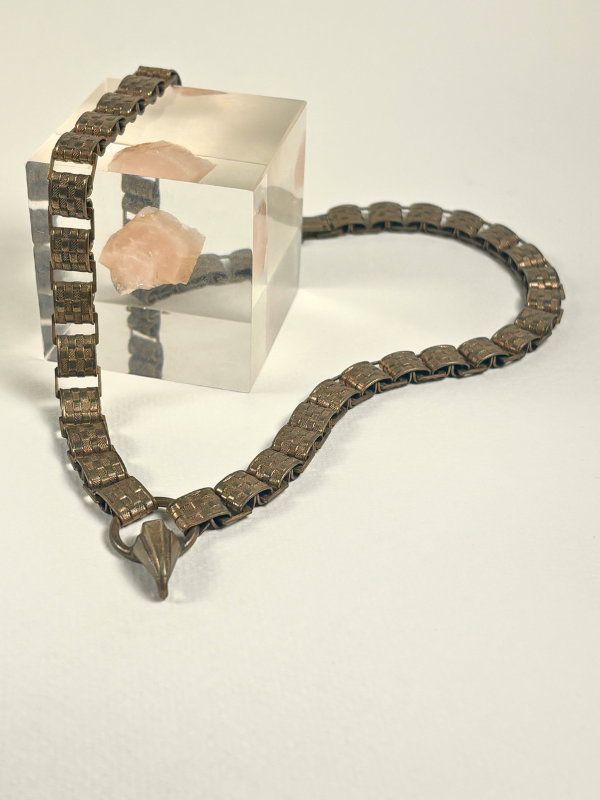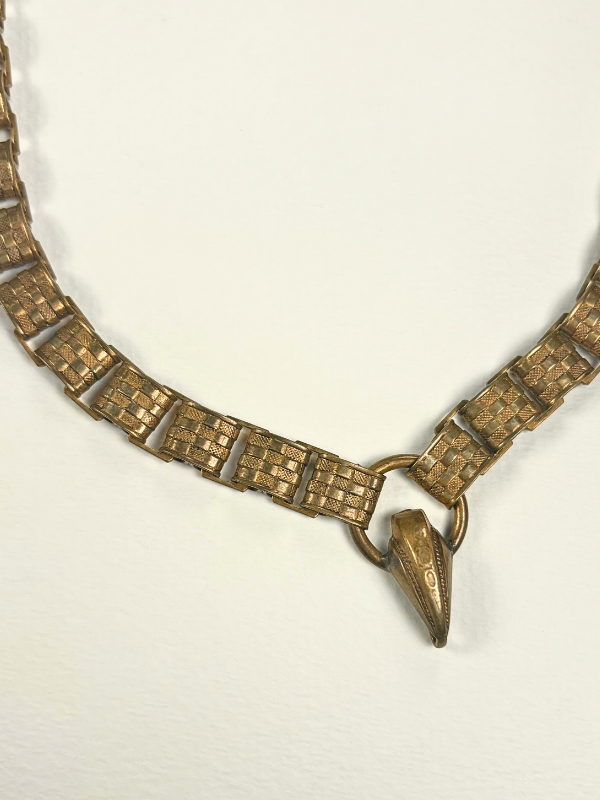 Step into the elegance of the past with this exquisite Vintage Victorian Book Chain Necklace, a stunning piece that seamlessly blends history with timeless beauty. Crafted in gold-fill, the necklace features a distinctive checkered detailing along the chain, showcasing intricate craftsmanship and a bold, structured design.