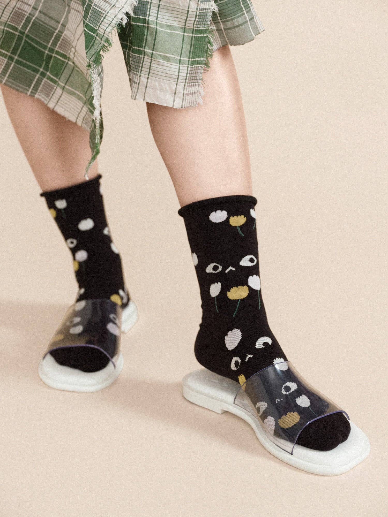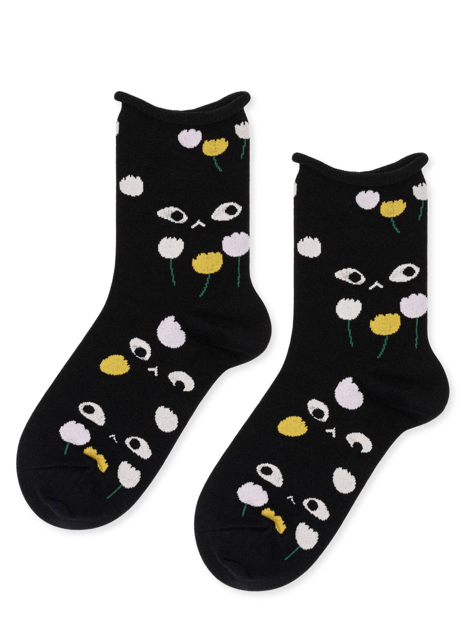 Look closely at these soft combed-cotton, rolled-cuff crews and see if you can spot some cute cat eyes among the tulips. Surprise!