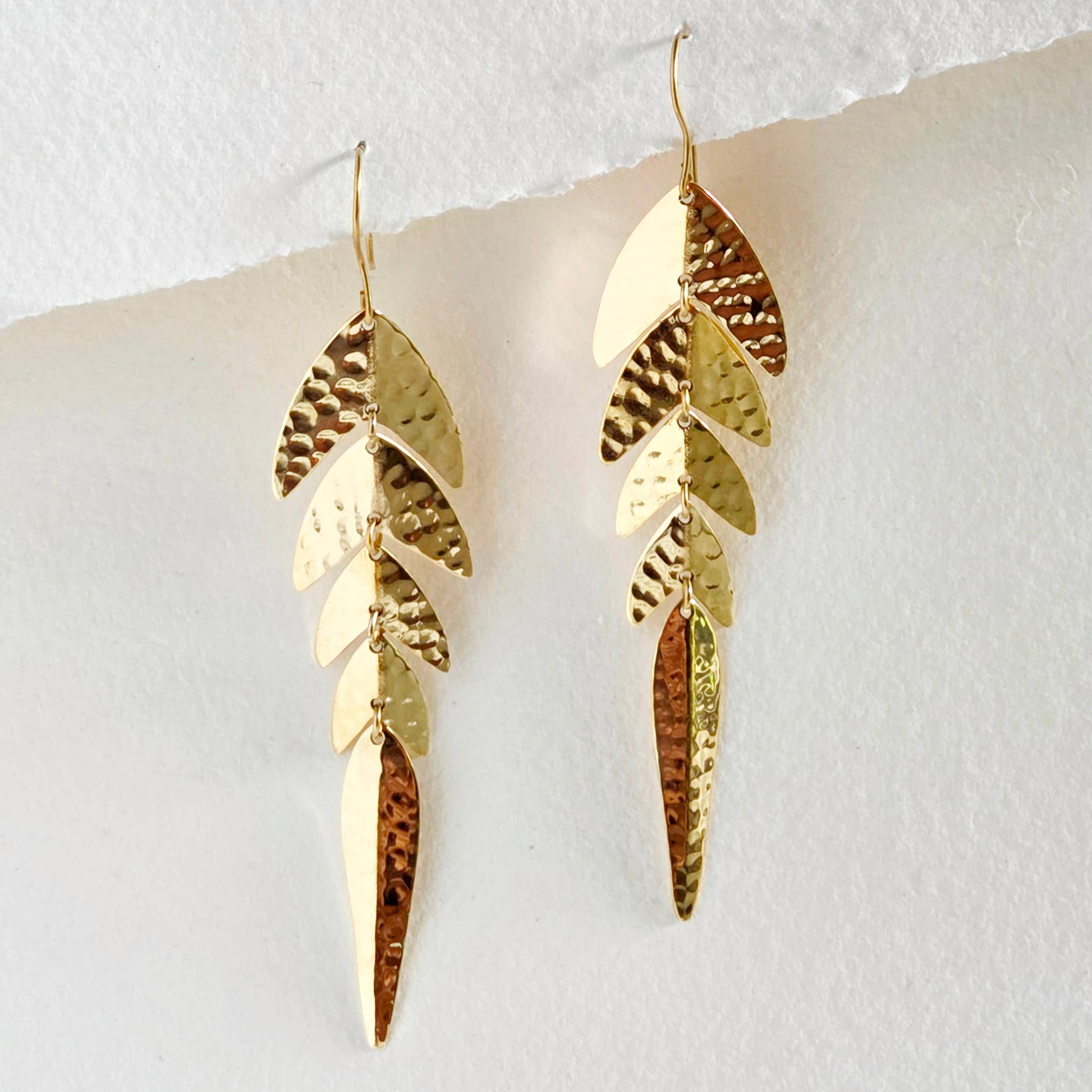 Hammered brass exclusive Bisjoux design. Connected handmade brass geometric pieced together to make these stunning chandelier earrings inspired by nature. Light weight and comfortable.