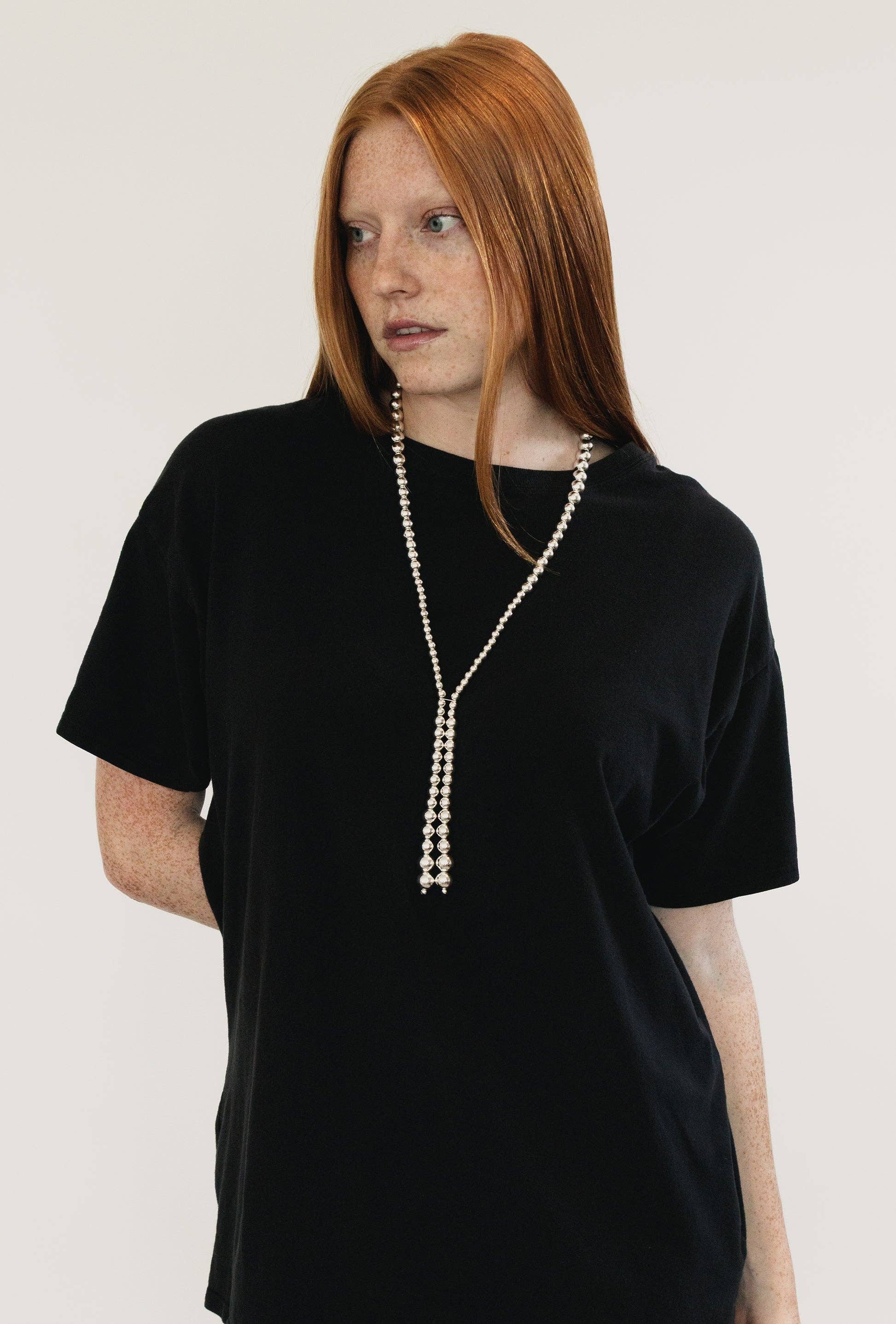 The Isere Necklace Long features a graceful lariat style with long silver hematite beads and a sterling silver clasp. Measuring an 18-inch drop to the bottom of the tassel, this is a standout statement piece. Also available in a short version.