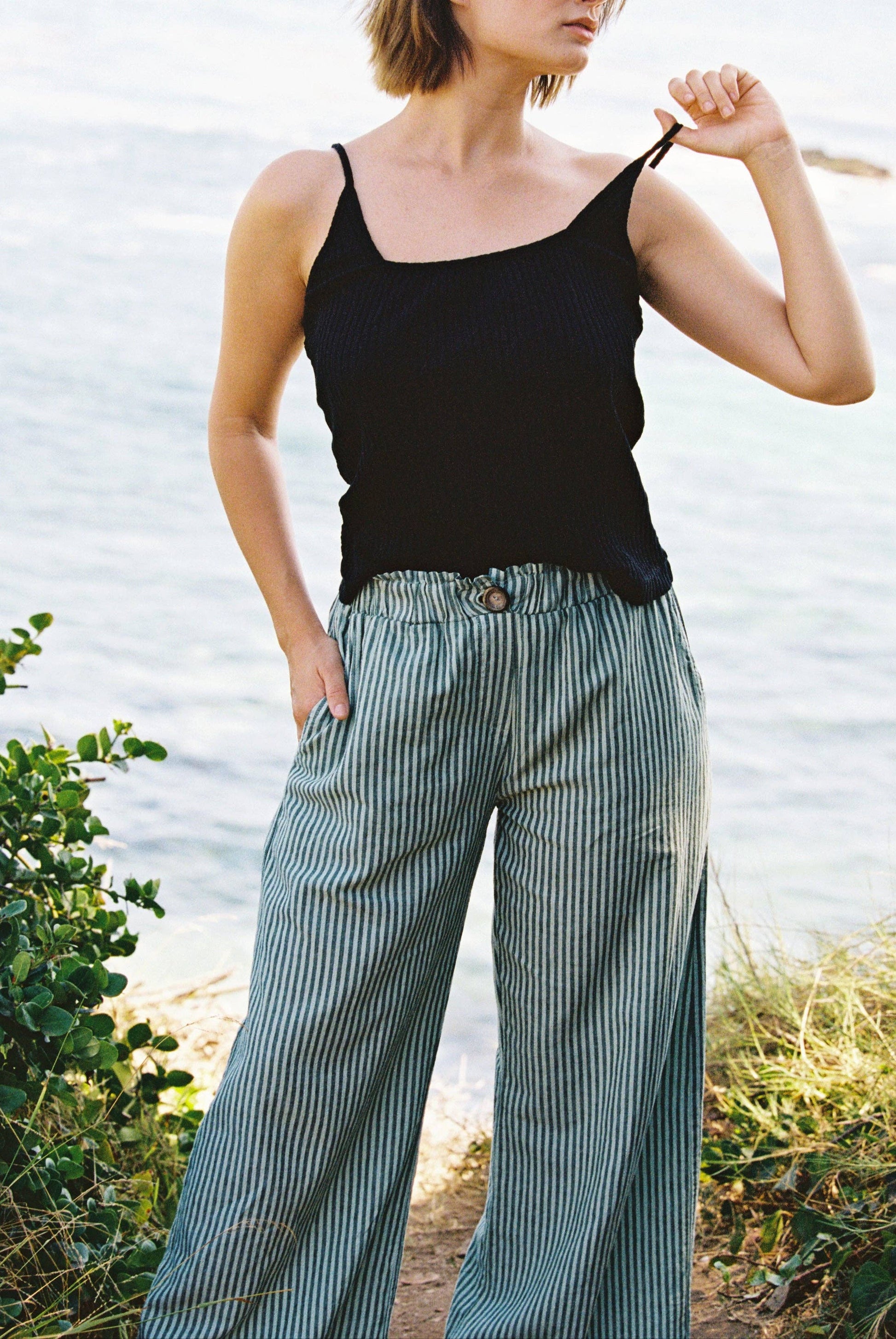 Our favorite everyday pant with flavor. Medium weight linen trouser featuring an elasticized waist band, tailored mock fly and hip pockets. Ankle length with a wide hem. Inseam is ~29".